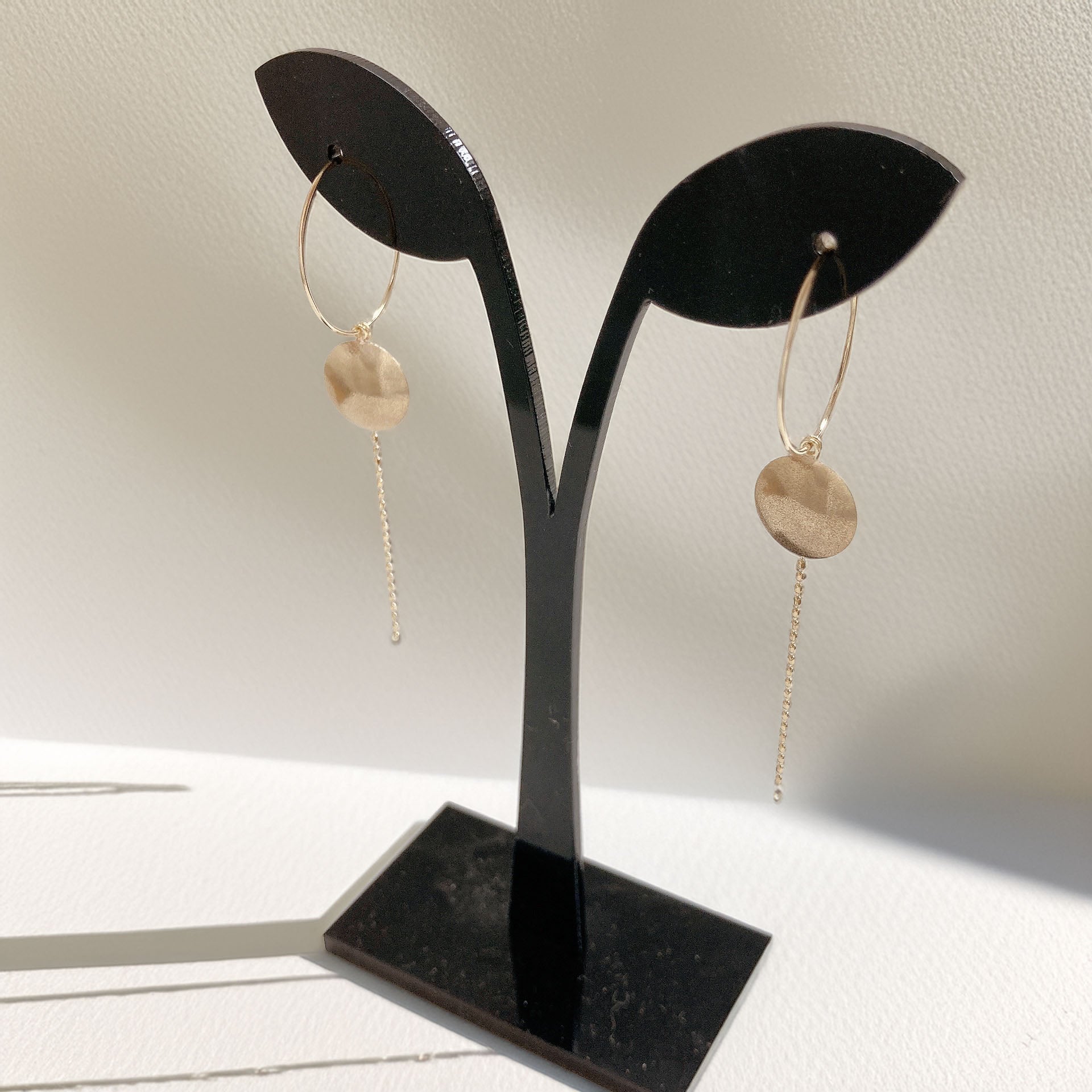 High-quality jewelry earrings. These charm earrings, with their striking small surface finish, are not too flashy and will add color to your ears for everyday wear or dressy occasions. The circle plate features a gentle curve and an impressive surface finish. The charm sways smoothly with every movement, demonstrating the high level of craftsmanship at a glance. Made in Japan by Japanese craftsmen using 10K gold, popular metal today, which is hard and resistant to deformation.